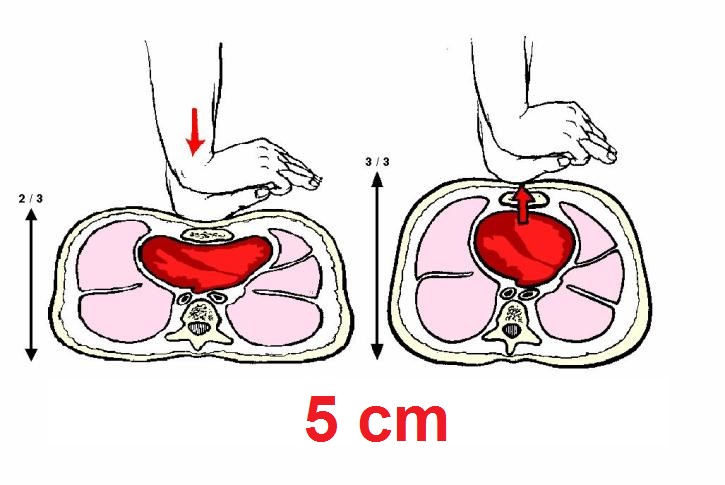 Resim 1. Aralıksız kalp masajında bir piston gibi eller göğüs kemiği ortasına aktif bası uygularken, bası kaldırıldığında pasif olarak gevşeme gerçekleşir. Sadece kalp masajı ile bası sırasında kalpten kan pompalanır ve hasta 250 ml kadar nefes verirken, gevşemede kalp kanla dolar ve akciğere 250 ml kadar hava girer.